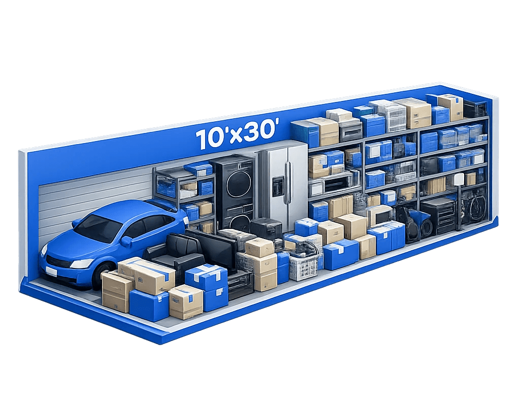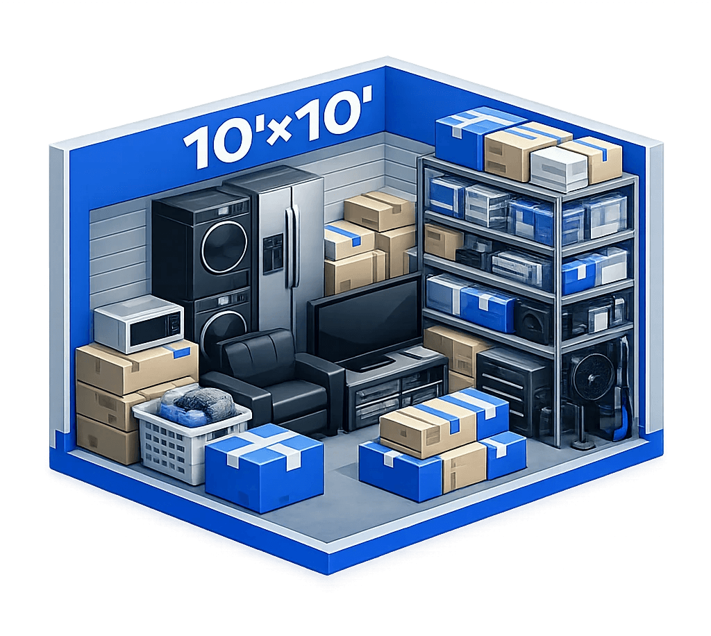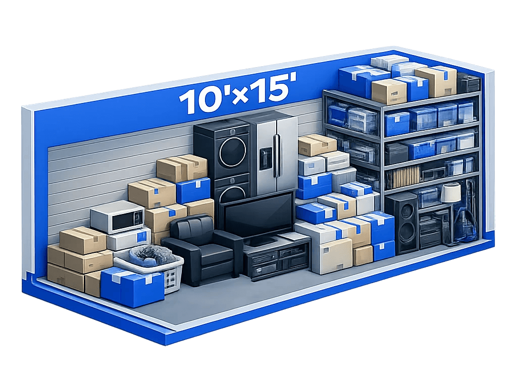 A two-bedroom apartment or house including appliances, boxes, and misc items. Also a good fit for commercial storage.