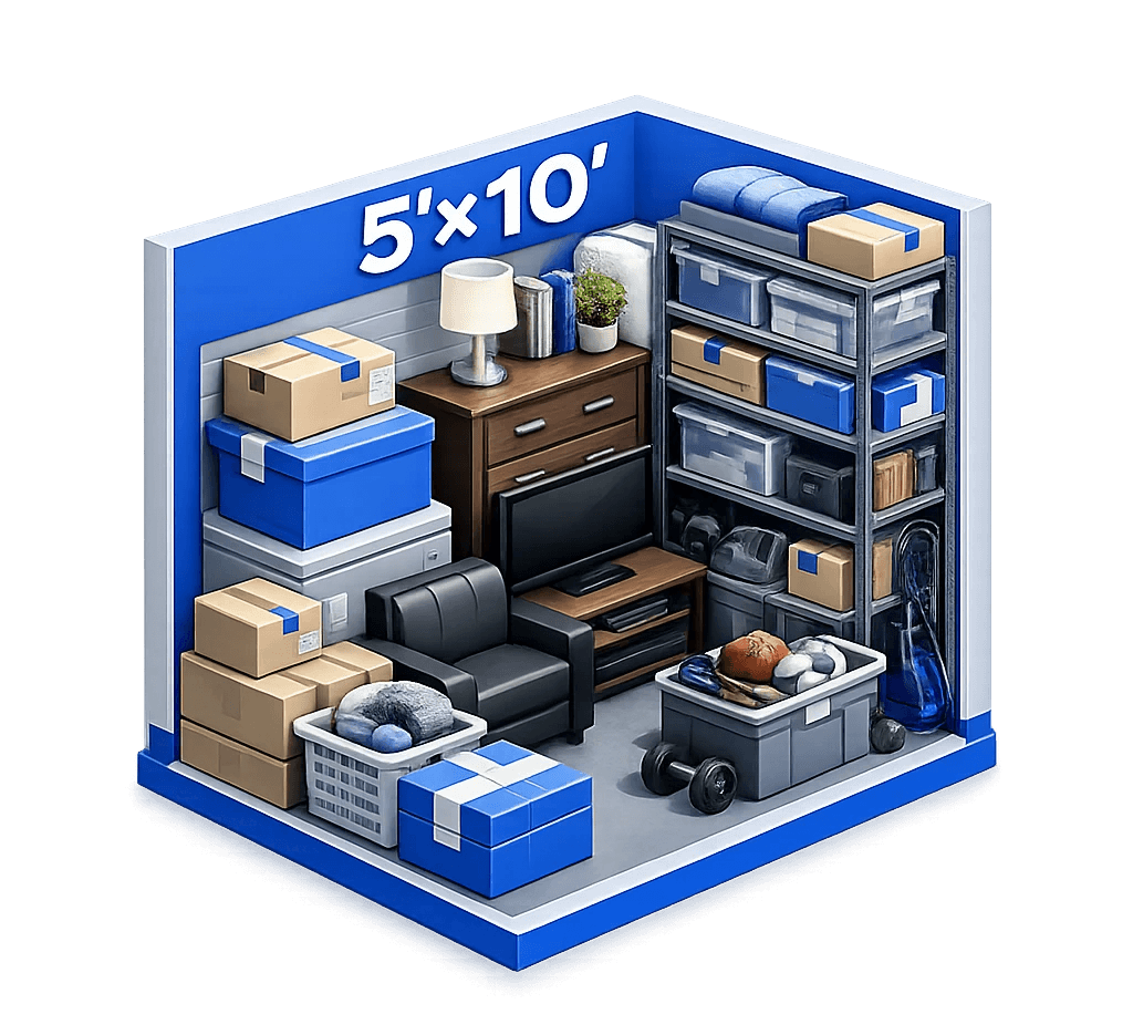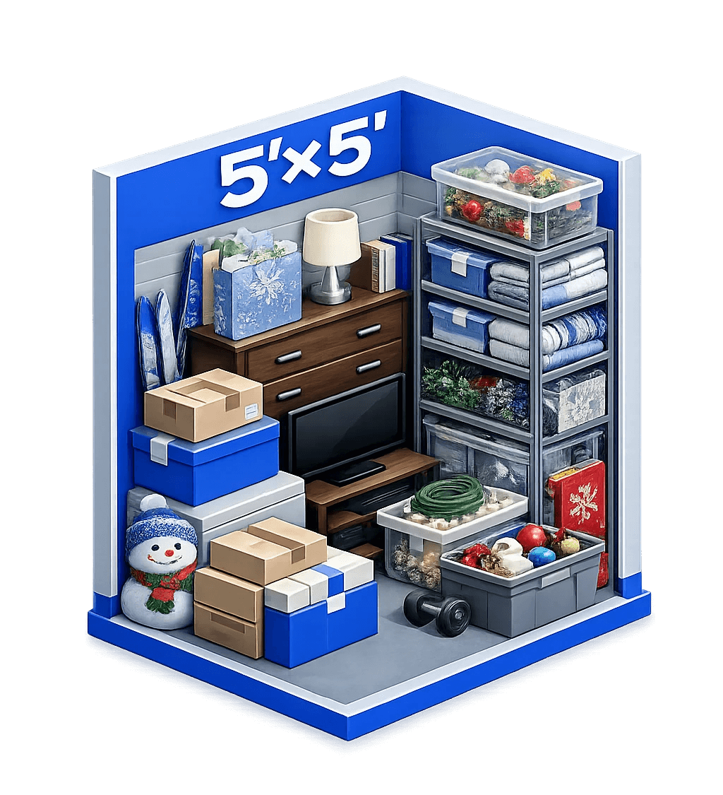 Personal items, clothes, boxes, small appliances, small furniture items, holiday decorations, sporting equipment.